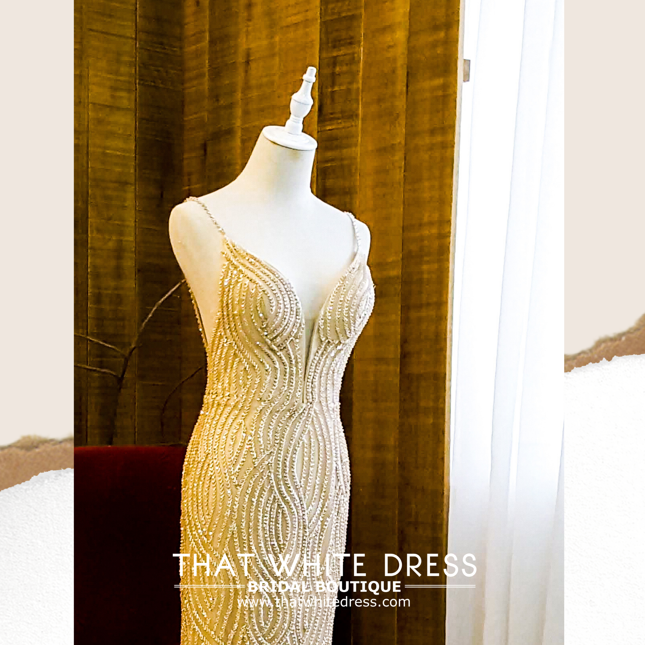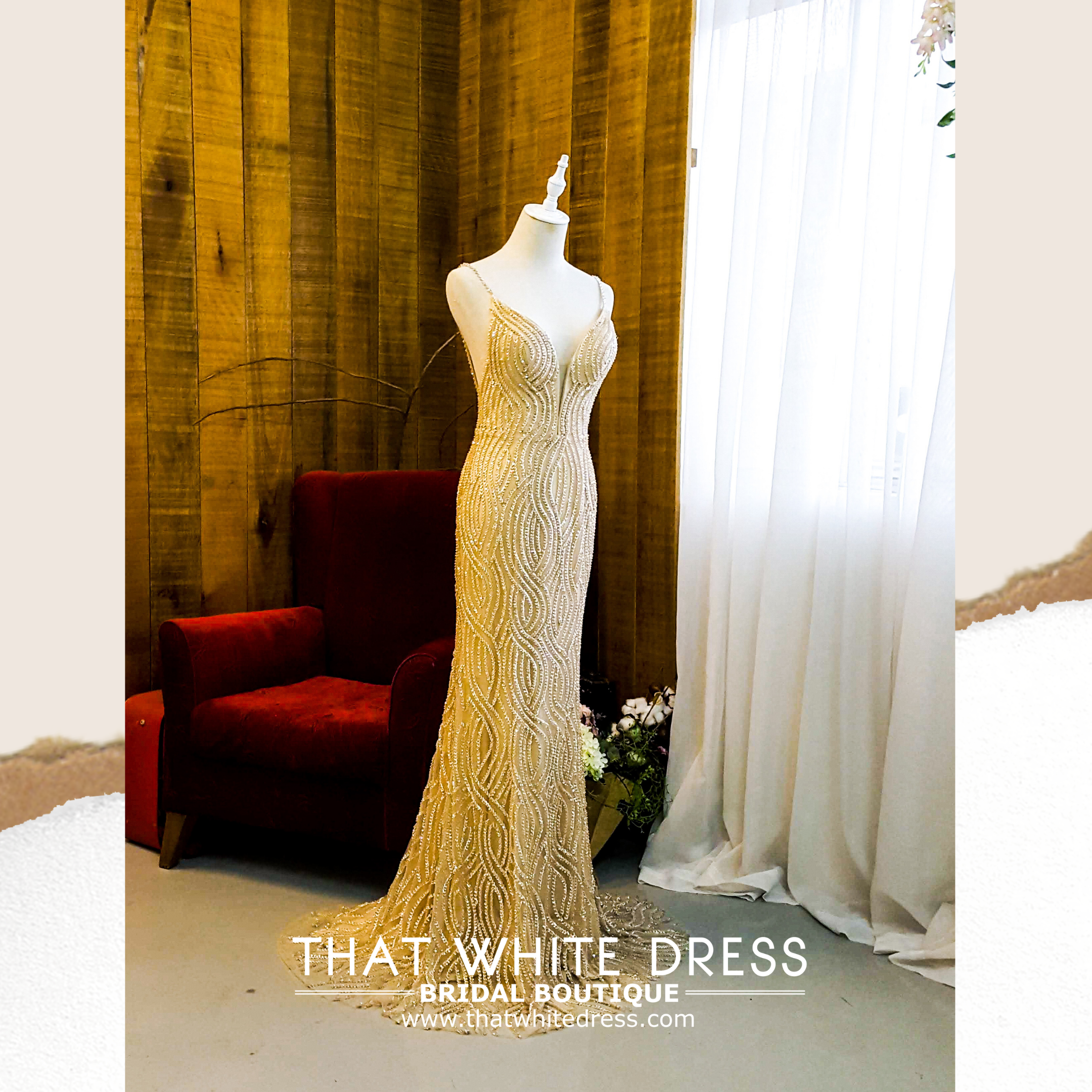 906LLE02 Thrisha Gold Spaghetti Strap full beadings sequins Trumpet Mermaid Bride Wedding Gown Premium Designer Malaysia rental