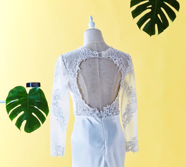Beautiful keyhole back details. Can be teamed with a detachable long sleeves inner garment to convert it into a conservative covered back dress suitable for church wedding, muslimah wedding/majlis perkahwinan, or nikah.