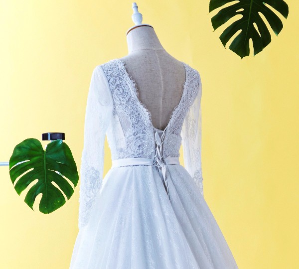 Beautiful Low back details. Can be teamed with a detachable long sleeves inner garment to convert it into a conservative covered back dress suitable for church wedding, muslimah wedding/majlis perkahwinan, or nikah.