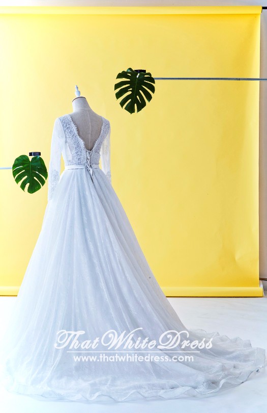 Long sleeves weding dress in elegant big A line/Princess style. Low V neckline embroidered in French Alencon corded lace, teamed with luscious soft French Chantilly skirt. Can be accessorized with a sparkling Swarovski crystal and rhinestones belt.