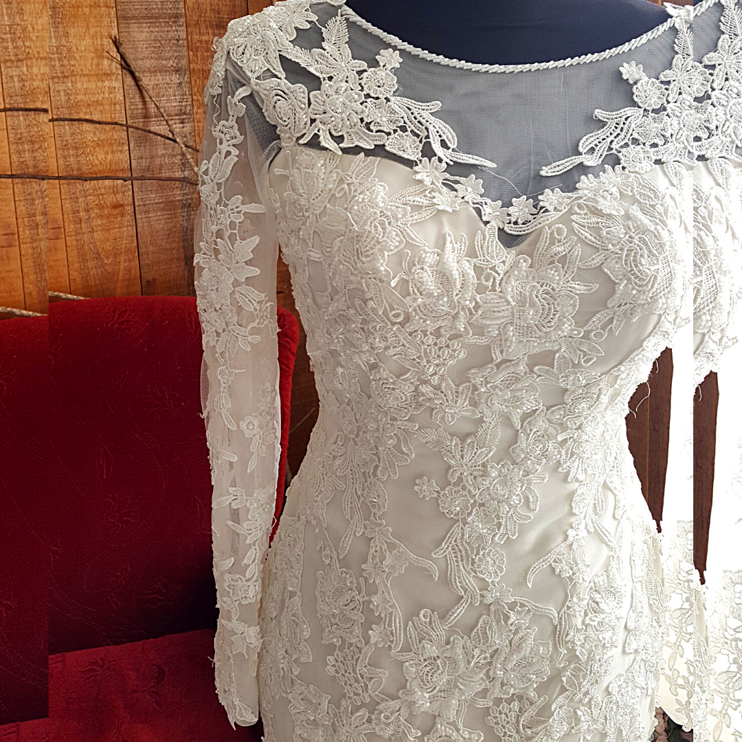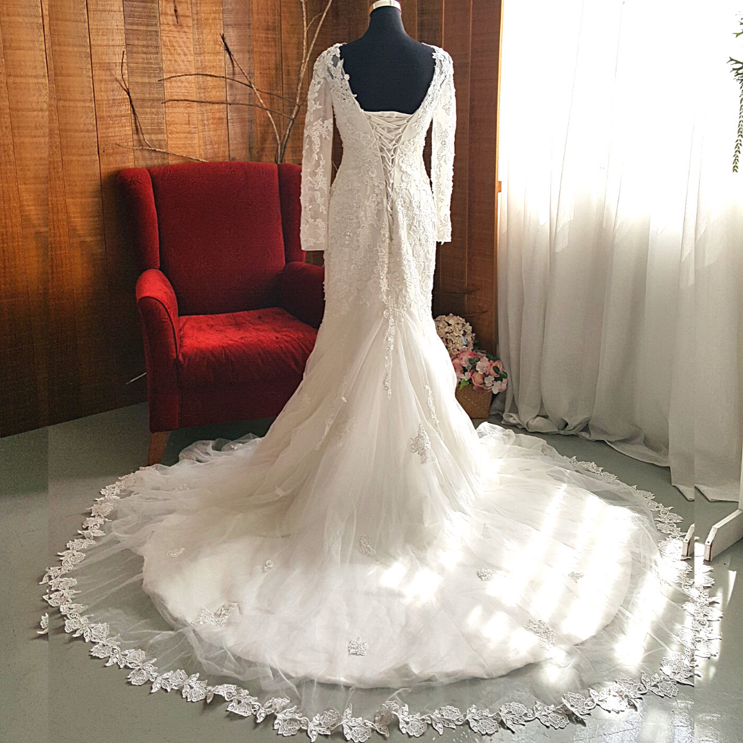 Long sleeves wedding dress in elegant mermaid/trumpet style. Featuring beautiful French embroidered floral lace with swarovski crystals.