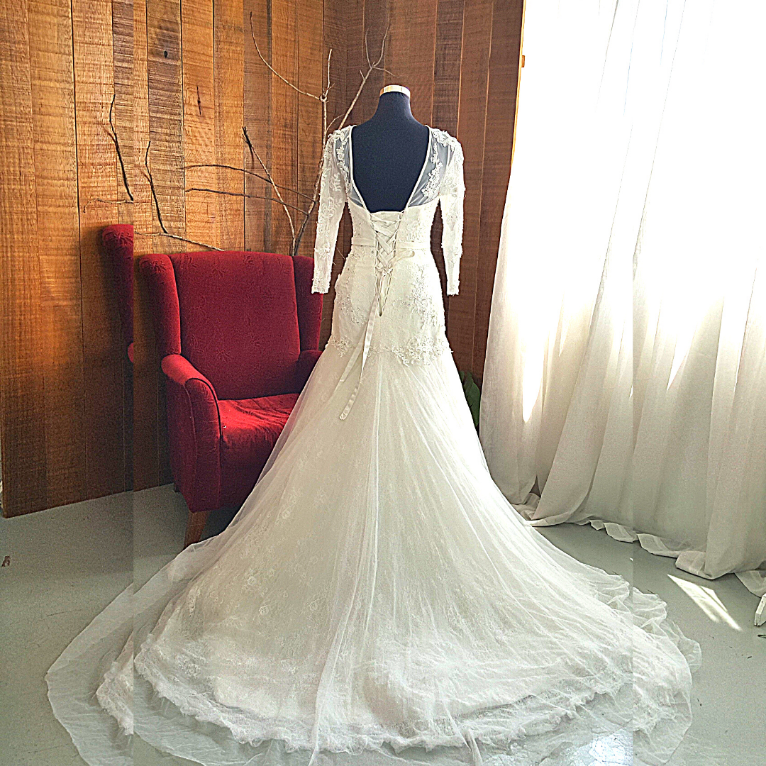 Couture design long sleeves wedding dress in trumpet cut in elegant French Chantilly lace with Italian lace embroidery.