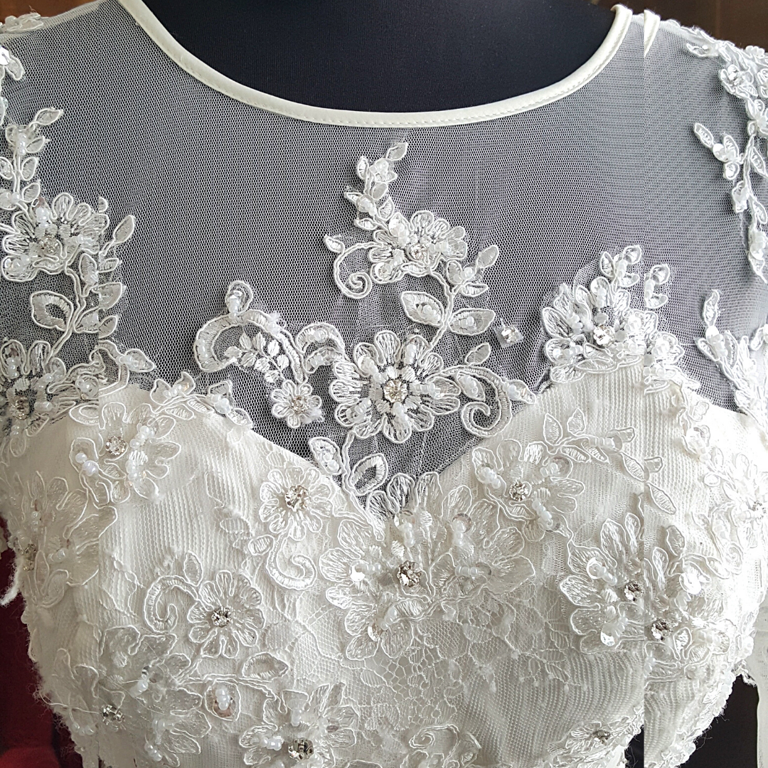 It features a beautiful illusion neckline with gorgeous lace embroidery that will guarantee to be the highlight of the wedding reception or registration.