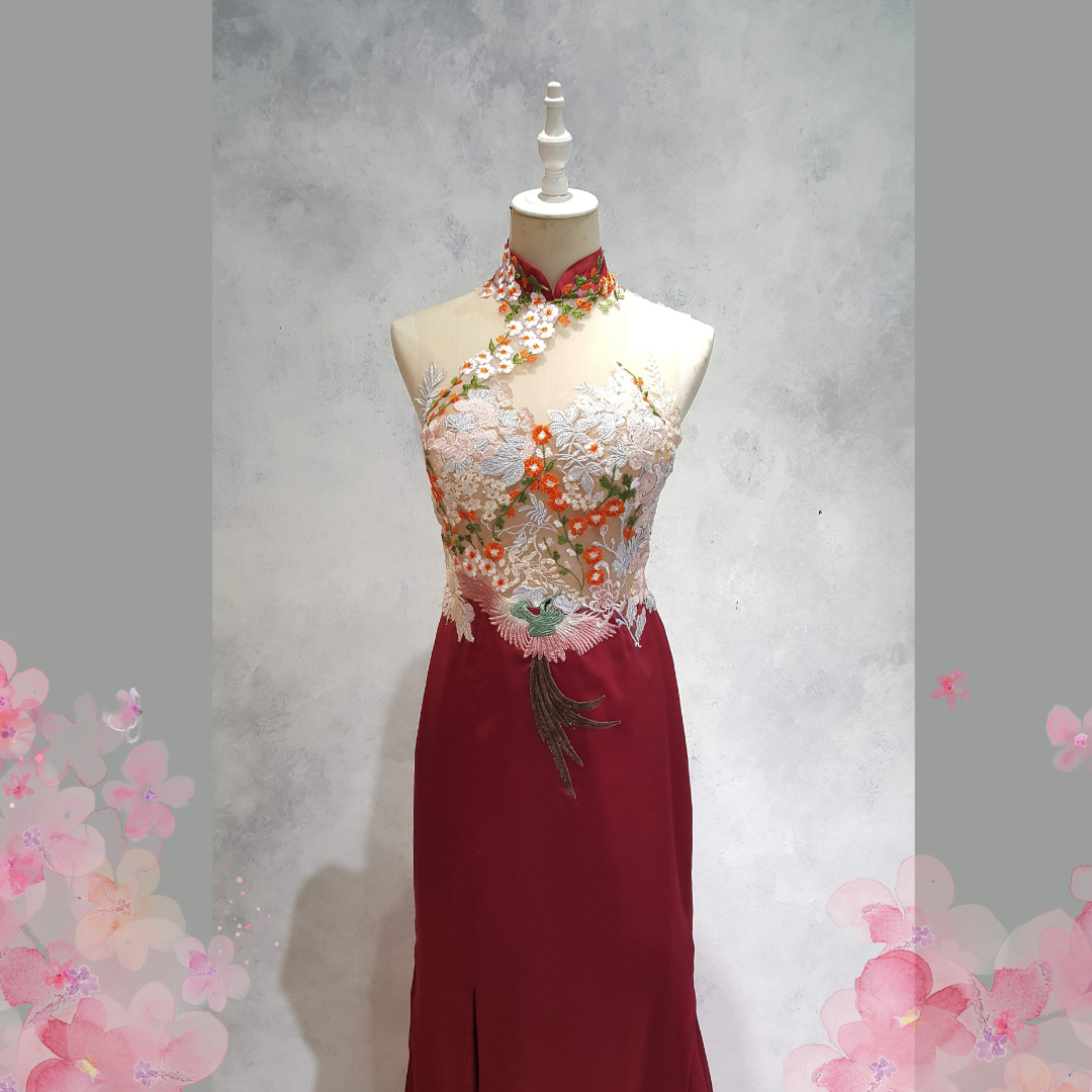 219EL01E01 Dey Cheongsam Red Satin Skirt Halter 14 Oriental Cheong Sam Qi Pao rental Malaysia Kuala Lumpur Petaling Jaya