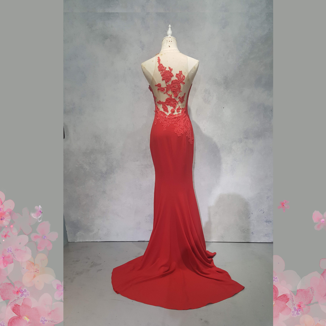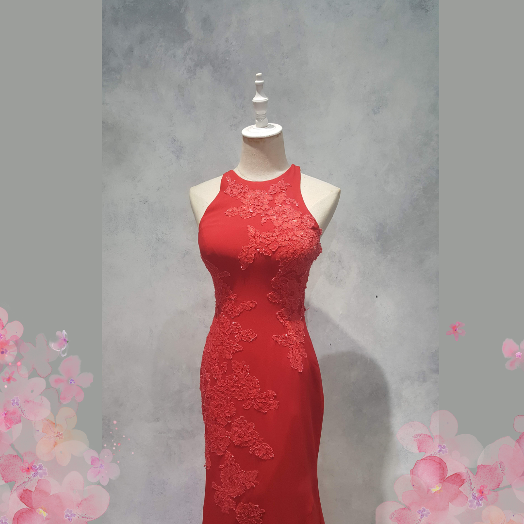 Evening Dress CC610E04 Red Halter Back illusion French Lace Chiffon 39 Oriental Cheong Sam Qi Pao rental Malaysia Kuala Lumpur Petaling Jaya