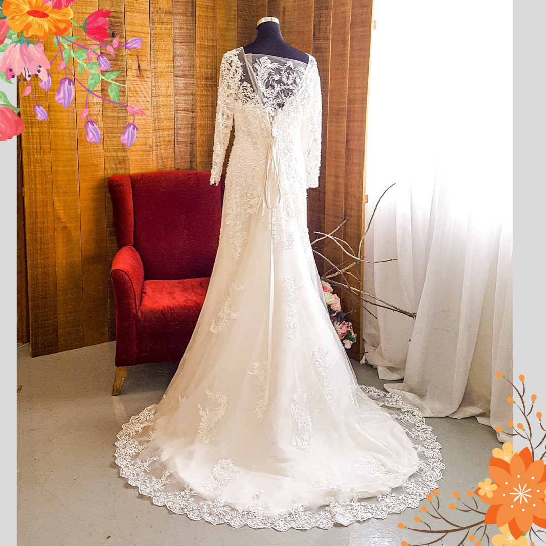 Featuring a beautiful lace embroidery with elegant beading details, this gorgeous wedding dress is both elegant and timeless!