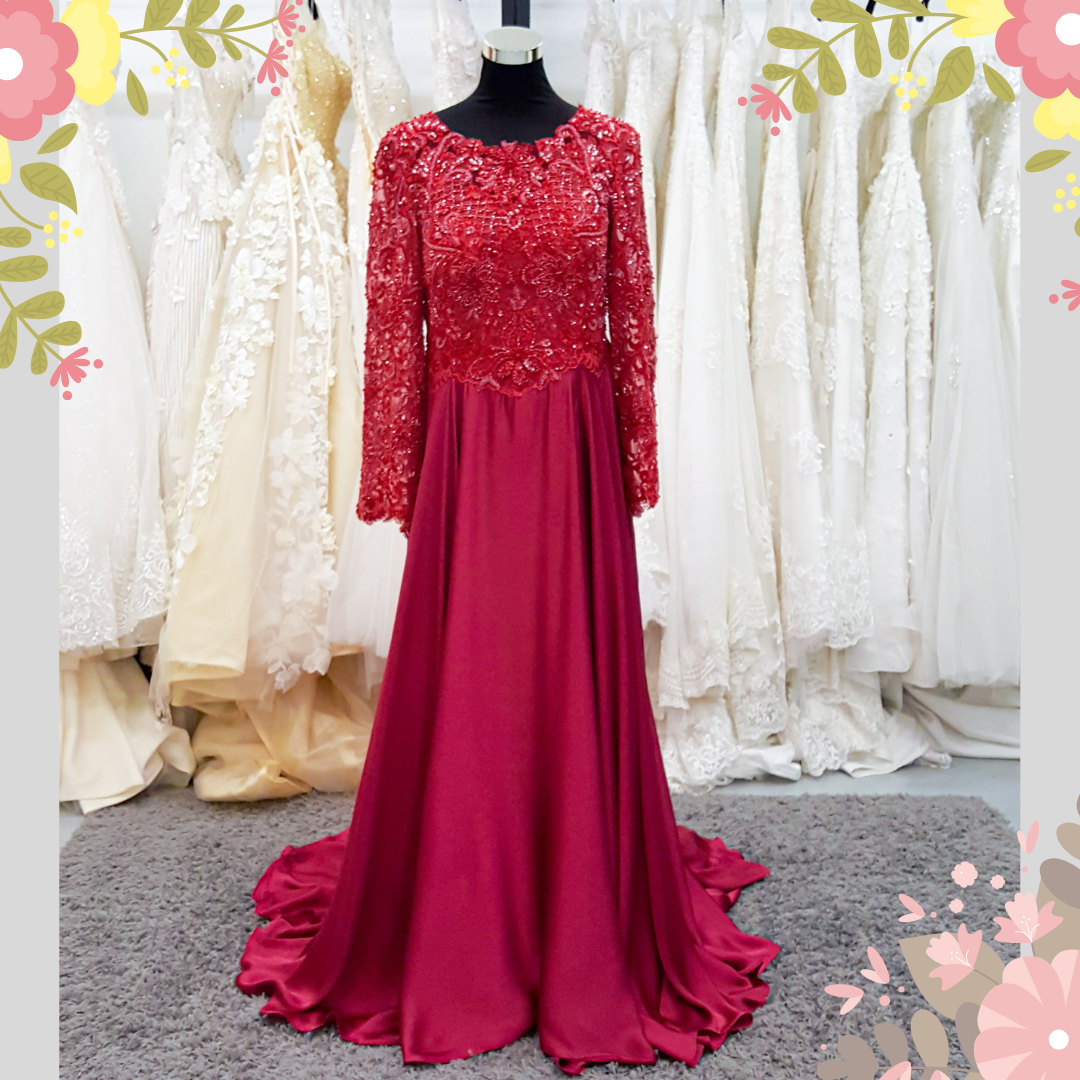 909LLEL01 Umie Maroon LS Chiffon Lace 2 Long Sleeves Wedding Dress Rental Kuala Lumpur, French Lace wedding Dress rental Malaysia,