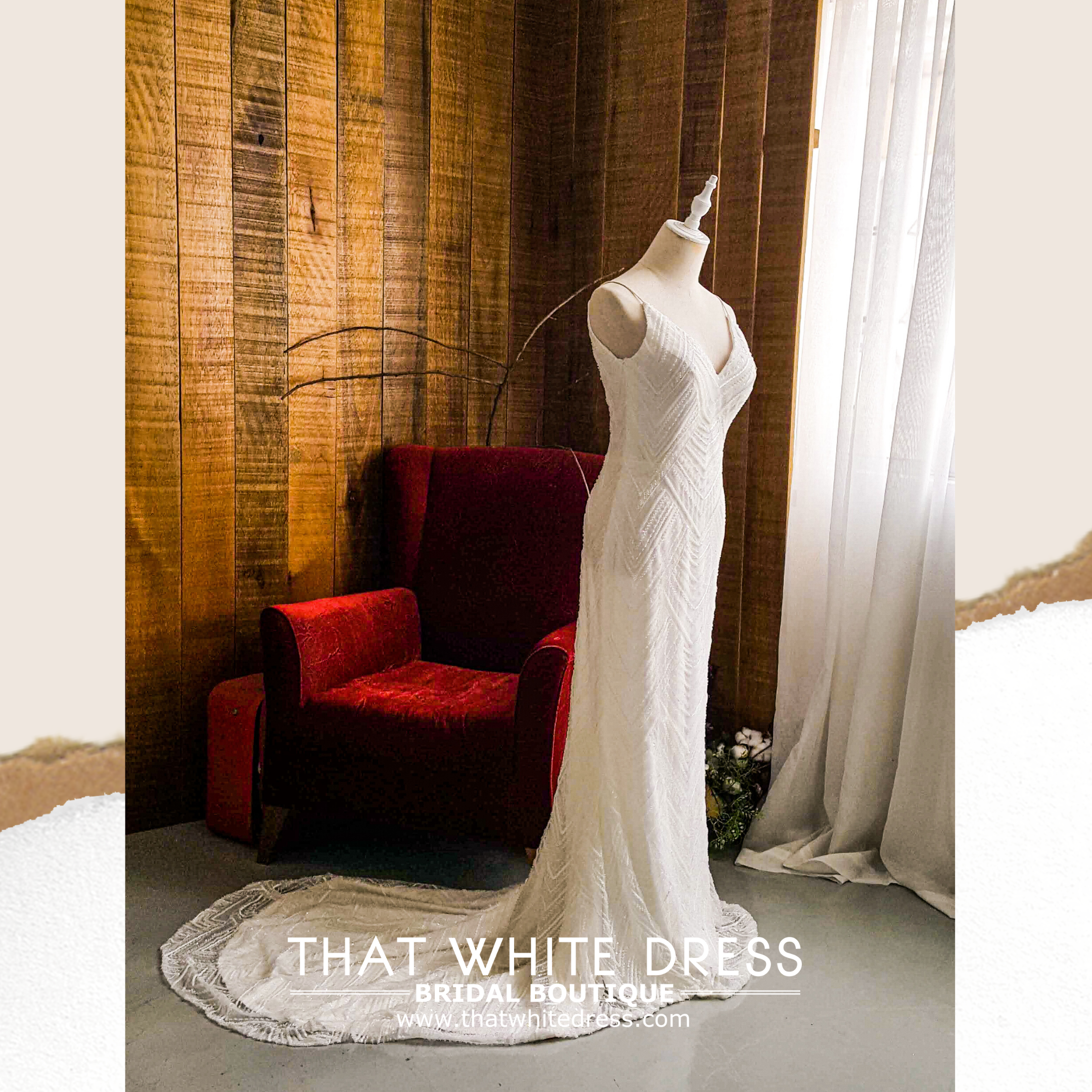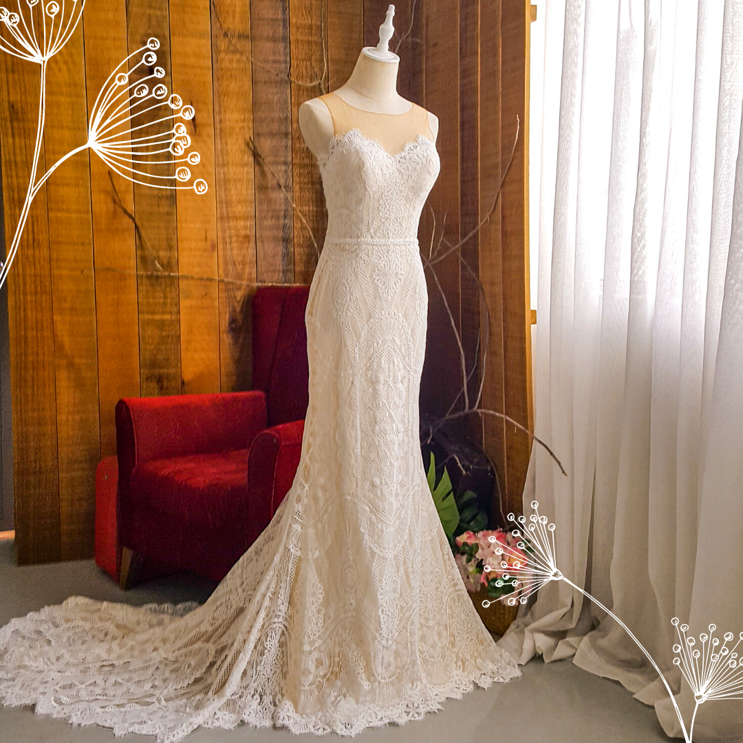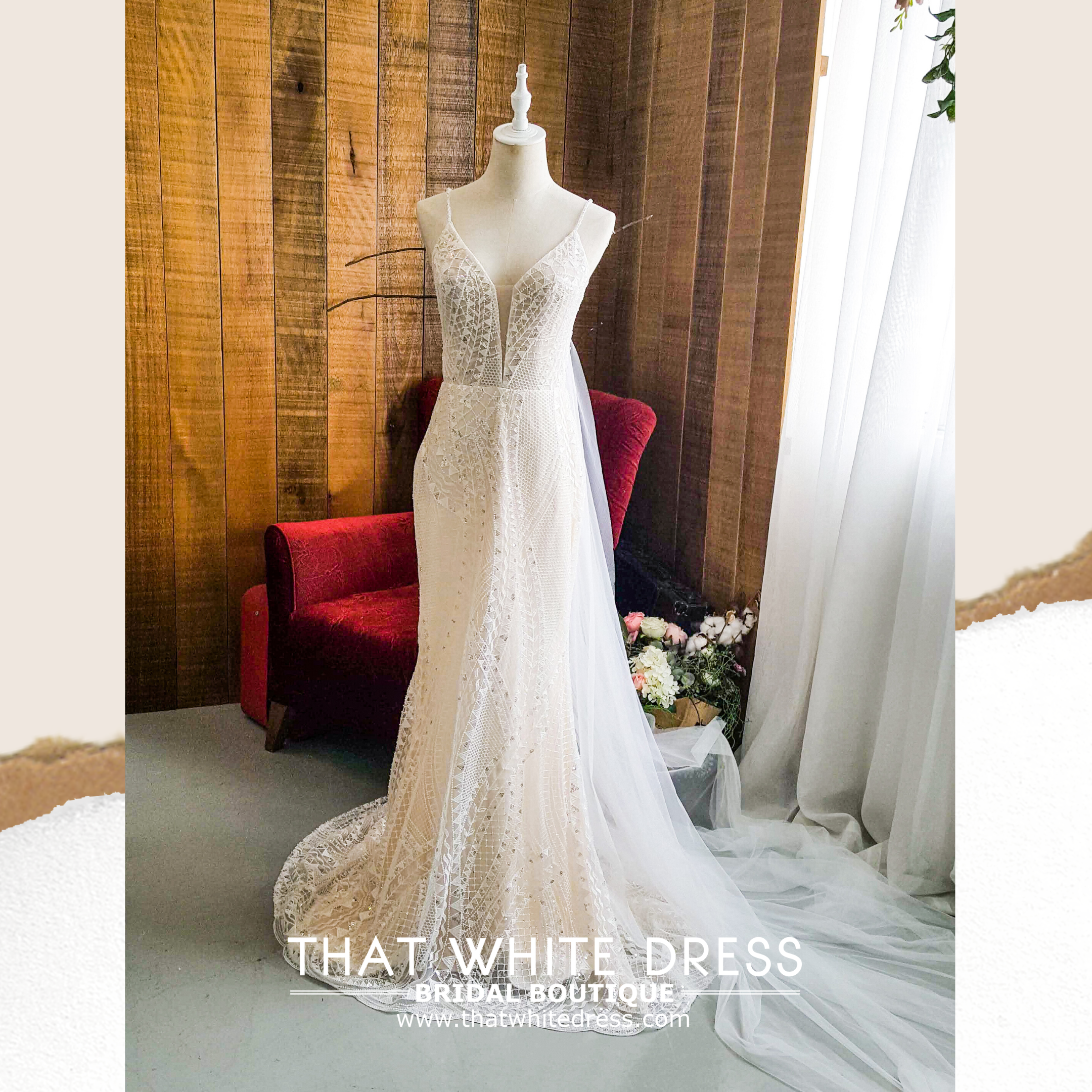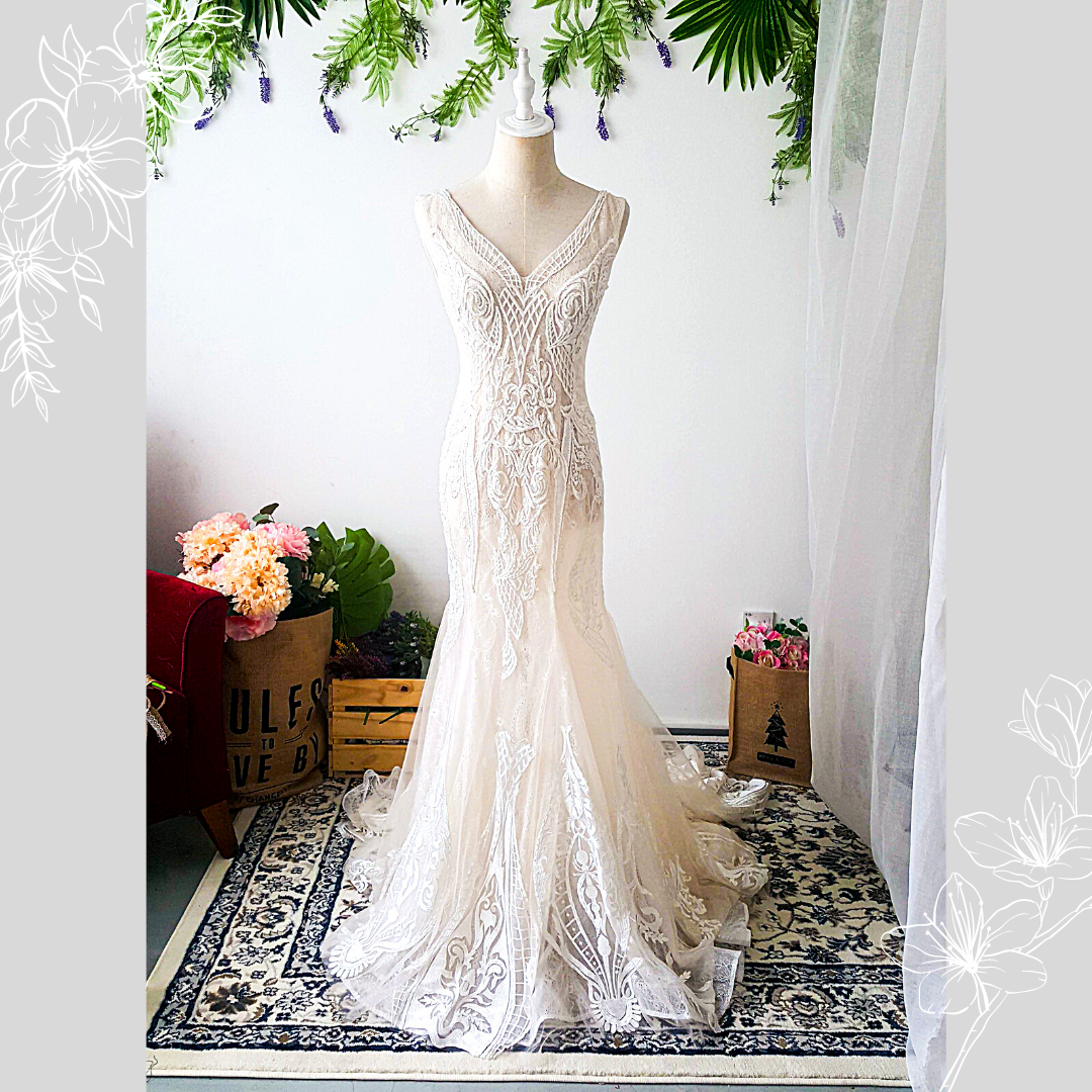 807XNW01 Chloe Boat neck illusion neckline Deep V Sparkle Trumpet a Malaysia wedding dress rental