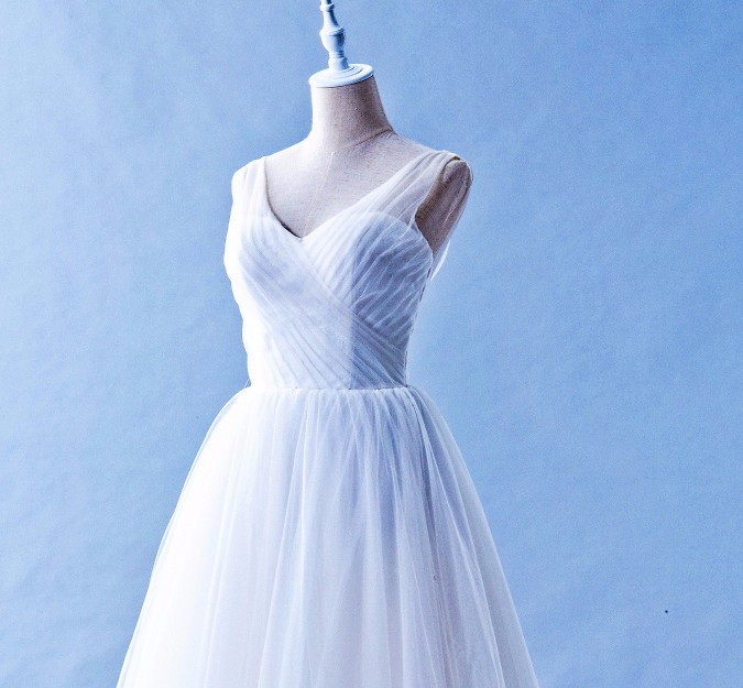 Lov V neck wedding dress with pleated tulle corset bodice and a big A line soft tulle skirt. Classic and classy.