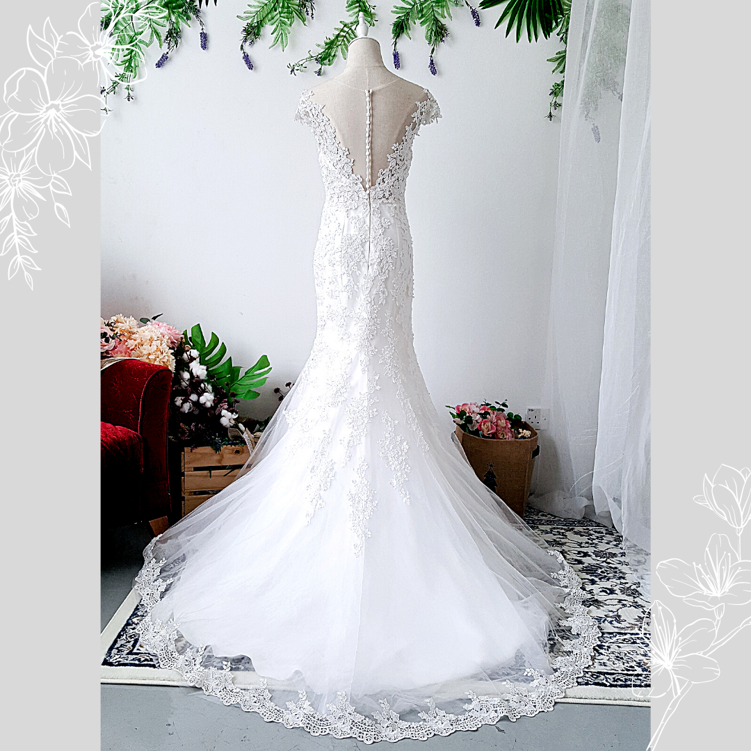 711LLW01 Celine illusion off shoulder guipure trumpet bride wedding dress Malaysia rental designer button back