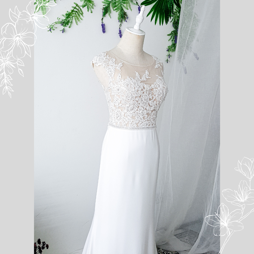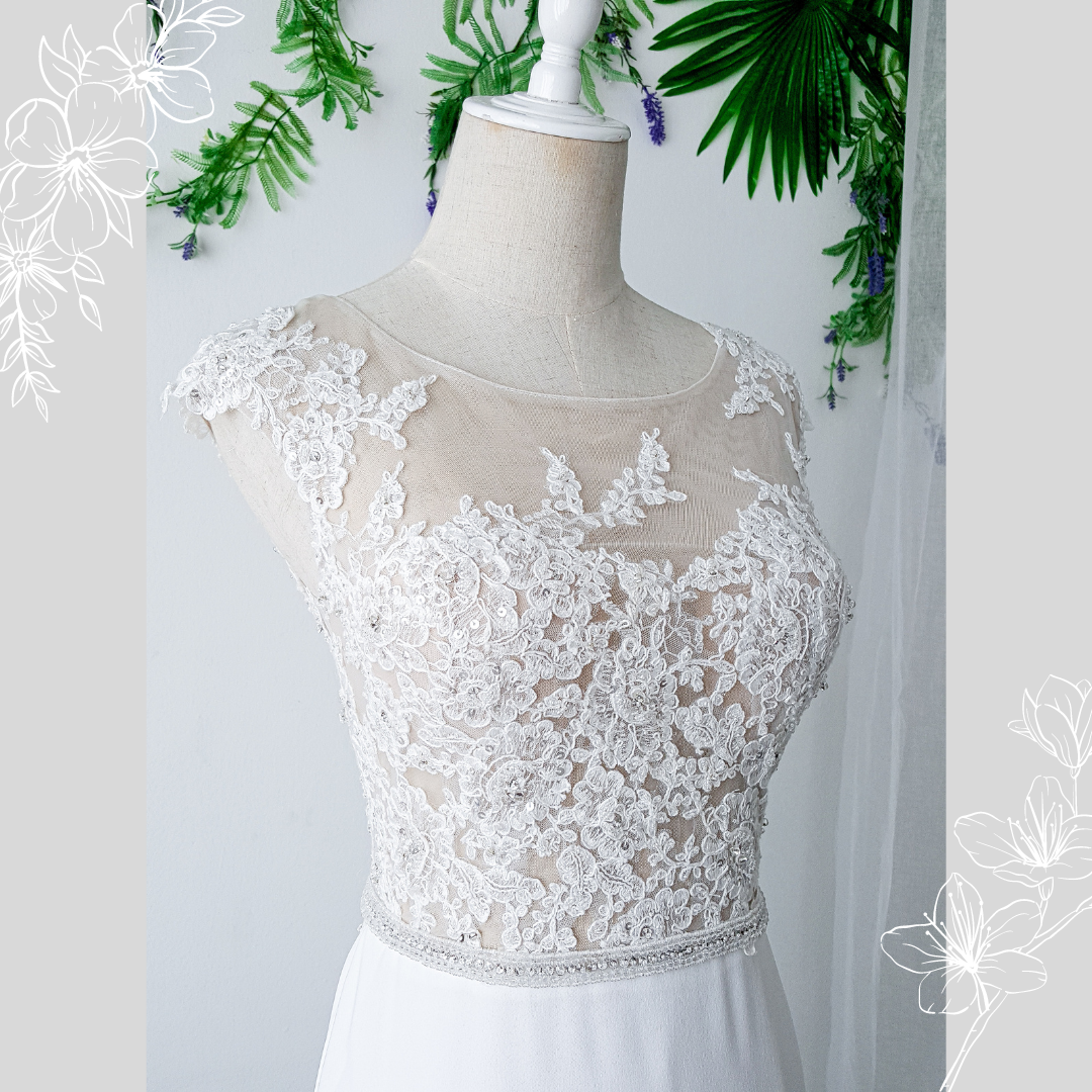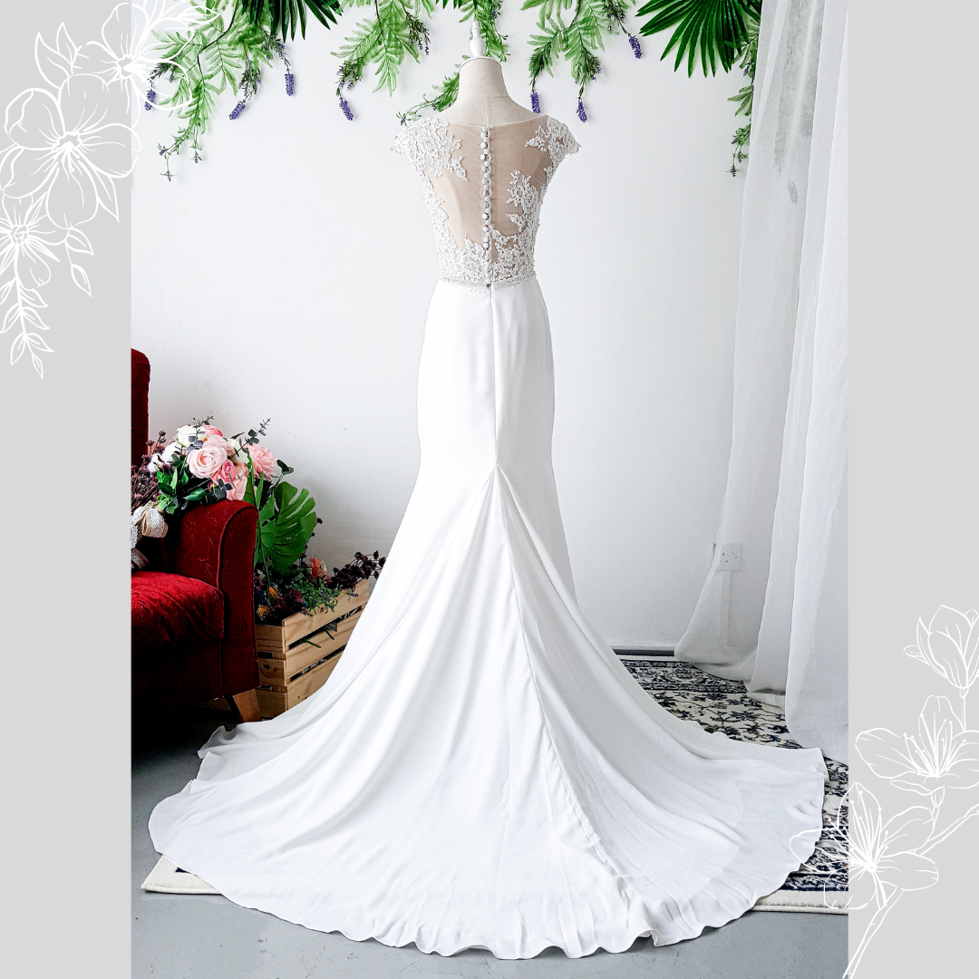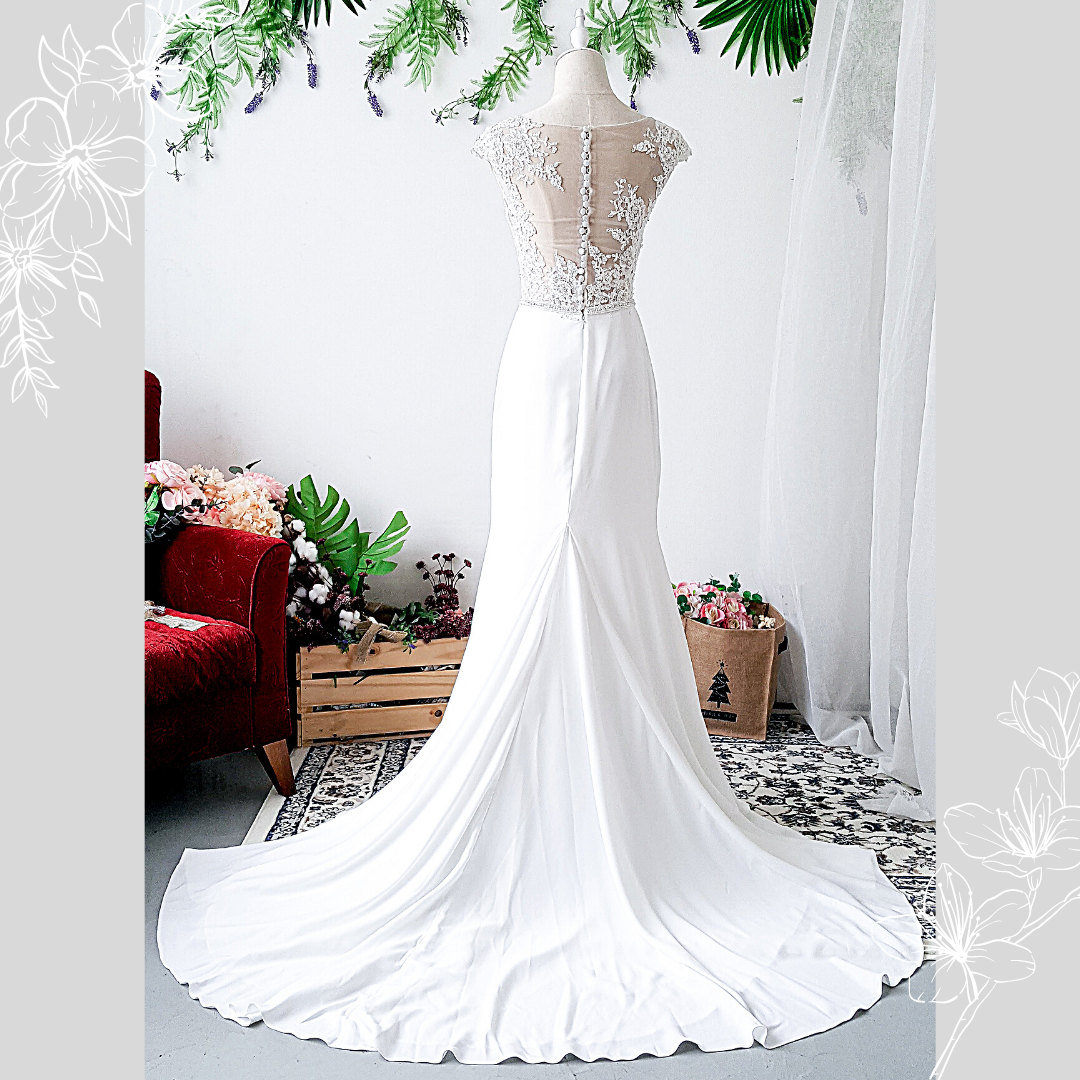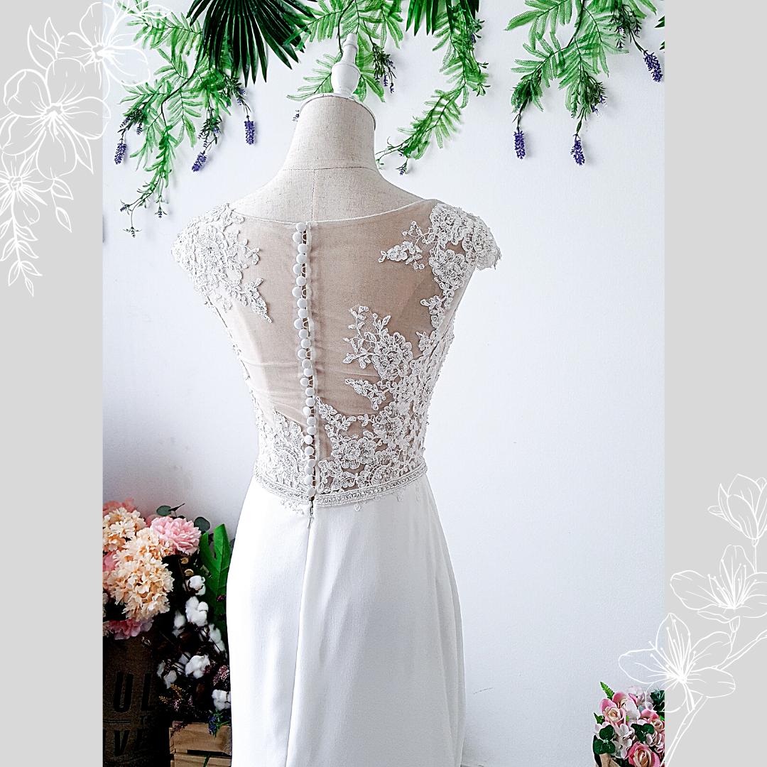 808BYW02 Monroe Cap sleeves lace Illusion neckline Plain Crepe Chiffon Minimalist bride wedding Malaysia Button Back