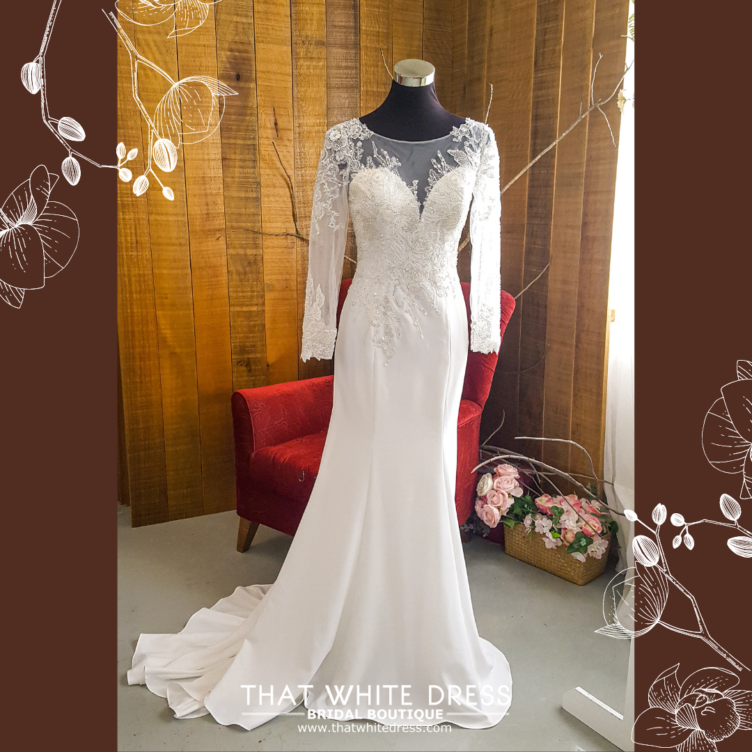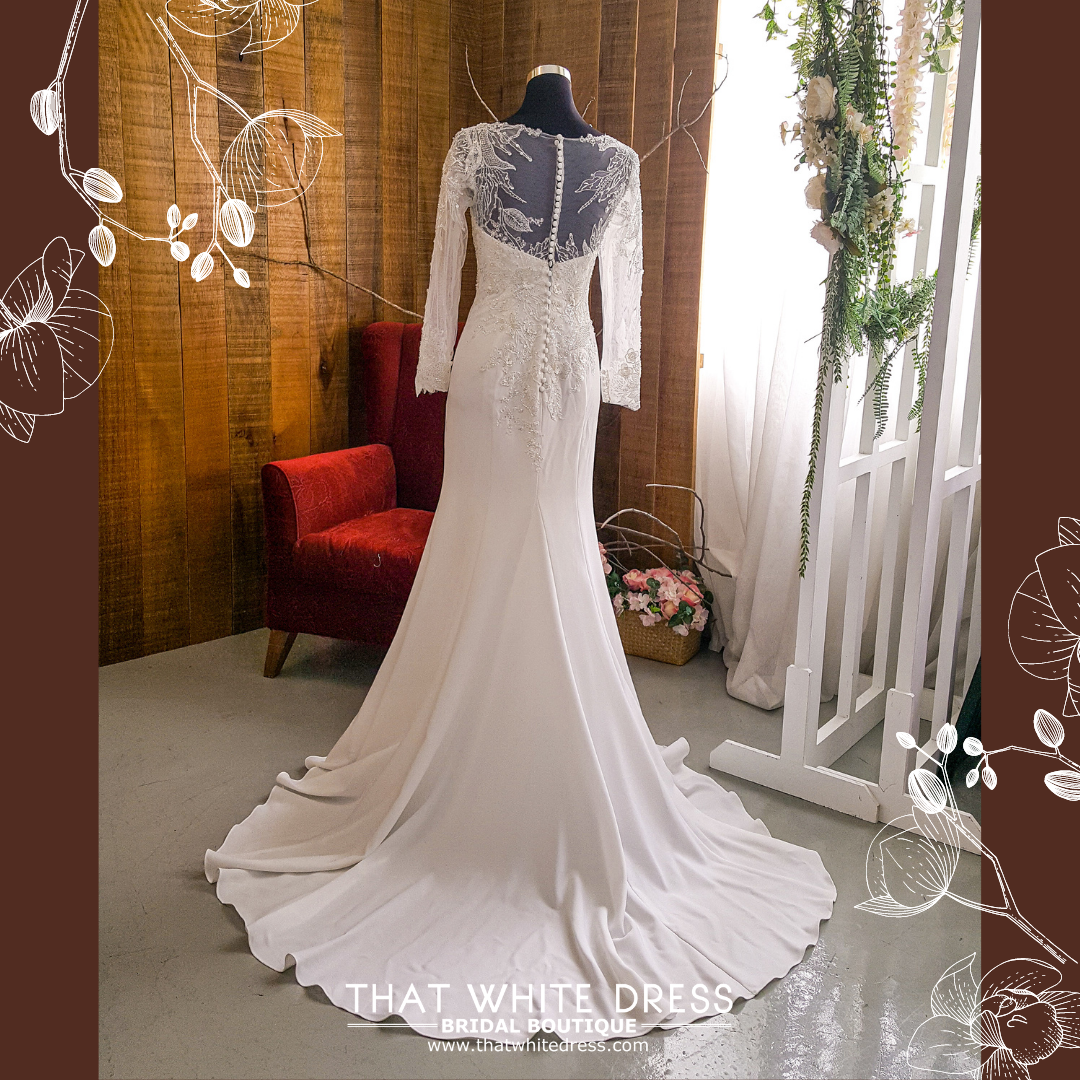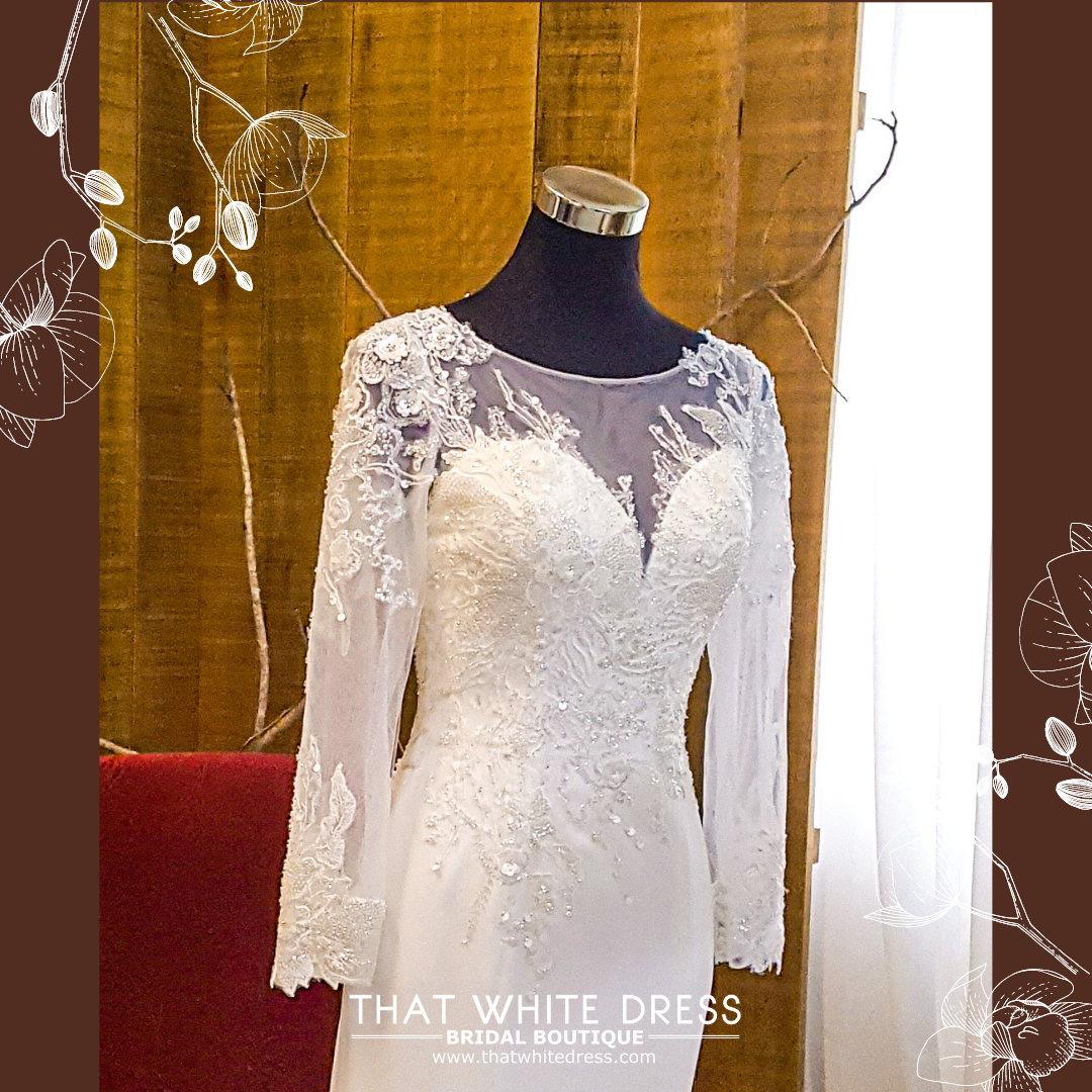 211BY11W03 Ashley Long Sleeves Button back Silk Satin Lace Sheath Silver trumpet b Gaun Pengantin Muslimah Malaysia sewa Kahwin Nikah